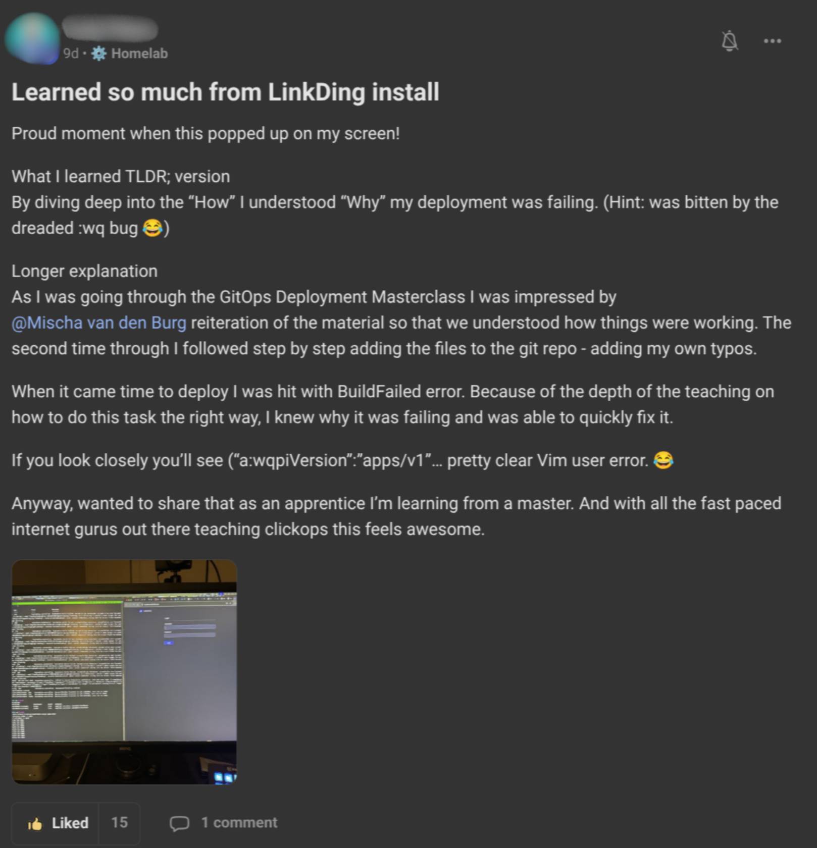 Hey Reader, Everyone tells junior engineers to use AI. “Be more productive.” “Let ChatGPT write your code.” “Work smarter, not harder.” This advice is creating an entire generation of helpless engineers. I’ve been mentoring DevOps engineers for years now. I’ve helped 800+ people land six-figure tech jobs. And I’m watching AI ruin careers before they even start. Here’s what nobody wants to tell you: If you can’t function without AI, you’re not an engineer. You’re a prompt typist. And companies are starting to figure this out. The Craft Cannot Be Shortcut The place where I help people land $200K DevOps & Kubernetes jobs is called KubeCraft. I gave it that name KubeCraft for a reason: Kube for Kubernetes. Craft for craftsmanship. This is not a bootcamp. Bootcamps churn out superficial factory workers who know where buttons are in a GUI. I take a different approach. The craft of the Kubernetes engineer starts long before Kubernetes. It starts with Linux. It starts with the command line becoming your natural interface with computers. It starts with text editing in Vim until it feels like breathing. When I was making my career change from nursing, I had mentors who told me this. “Learn Linux properly.” “Don’t jump into Kubernetes.” “Master the fundamentals first.” I didn’t think of this myself. I was taught by people who knew what actually matters. Now I’m passing those teachings forward. The 10% Problem Here’s what happens when you rely on AI: It works 90% of the time. You paste an error log into ChatGPT. You get an answer. It works. You feel productive. Then you hit the 10%. The AI gives you an answer that doesn’t work. You try again. Still doesn’t work. You rephrase the question. Circular answers. You’re stuck. You don’t know how to debug because you never learned. You don’t know where to look because you’ve never had to look. The AI ran you in circles for 3 hours and you have nothing to show for it. Now imagine this scenario: It’s 2 AM. Production is down. You’re SSHed into a server. No GUI. No internet access. No ChatGPT. Just you, a terminal, and a broken system. Can you debug it? Can you read man pages? Do you know ps, grep, find, journalctl? Can you navigate the filesystem and understand what’s running? If you’ve only ever pasted errors into AI, you’re useless. Reverse Engineer the Interview I’ve interviewed DevOps candidates. When I ask “How did you solve this problem?” I’m listening carefully. Now imagine you're sitting in that interview. And all you have to say is: “I pasted it into ChatGPT and got the answer”. It may sound obvious and stupid right now. But most people don't think this far ahead. It tells me this person can’t function independently. It tells me when things break, they’ll be stuck. It tells me they don’t have real skills. They have AI access. Here’s what you need to understand: Reverse engineer the interview situation. When you’re sitting across from a hiring manager, you need to demonstrate that you can think. That you can debug. That you understand the systems you’re working with. “AI helped me” is not a compelling story. “I checked the Kubernetes events, traced the error through the logs, realized the volume mount was misconfigured, and fixed it” that’s a story. That’s a hire. My Recommendation: No AI For Your First Year This will be controversial. In your first year of learning DevOps, do not use AI to generate code or solve problems. Use it as a sparring partner only. “Am I on the right track with this approach?” “What should I research next?” “Can you point me in a direction?” Never: “Give me the answer.” Never: “Write this code for me.” Never: “Fix this error.” You need to develop the skill of finding answers without AI. Searching documentation. Reading man pages. Debugging logs line by line. Googling error messages and reading obscure blog posts. These are the skills that make you a real engineer. When the AI fails (and it will), you need to be able to fall back on fundamentals. If you never built those fundamentals, you have nothing to fall back on. AI Amplifies Skills You Don’t Have Yet Here’s the principle: AI is an amplifier. It multiplies your existing abilities. But you need abilities first. Zero multiplied by anything is still zero. If you don’t know how to write a Python function, AI-generated Python is useless to you. You won’t know if it’s correct. You won’t be able to modify it. You won’t be able to debug it when it breaks. If you don’t understand Linux processes, you can’t verify what the AI tells you about debugging them. You’re just trusting blindly. And blind trust in AI is a career death sentence. The Long Route Wins I’m not going to promise you a job in 30 days. Some KubeCraft students have landed jobs 2 weeks after joining. But they already had experience. If you’re a complete beginner, your path is longer. That’s the truth. Anyone who tells you otherwise is a scammer. But here’s what the longer route gives you: Deep skills that stretch beyond DevOps. Thinking patterns that transfer to any technical role. The ability to debug any Linux system, anywhere, without help. A foundation that AI cannot replace. When I was a nurse making $50K a year, I had no CS degree, no bootcamp, no connections. I walked the long path. I learned Linux properly. I built homelabs and broke things. I struggled through problems manually. Now I’m a Microsoft MVP pulling multiple six figures. The long route works. Shallow Knowledge Gets Commoditized Here’s my prediction: In 5 years, shallow cloud engineering knowledge will be worthless. If your only skill is clicking around in AWS consoles or writing basic Terraform configs, AI will replace you. Not because AI is magical. Because those skills are shallow enough to automate. The engineers who survive will be the ones who understand systems deeply. Linux internals.