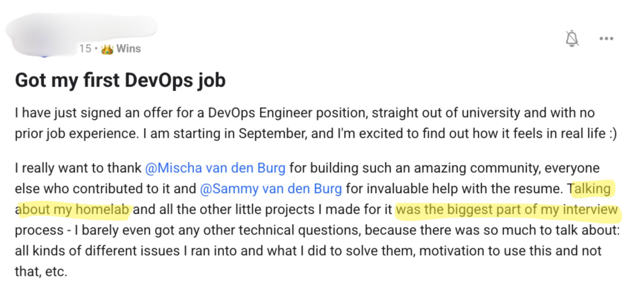 Open Create a repo, push some code, set up a mirror. See how it feels. Forgejo in KubernetesNow, I run my Forgejo on Kubernetes in my homelab. Getting it production-ready was not easy. Docker-in-Docker, network policies, non-root containers, self-hosted runners on a separate cluster… It took real work to get it right. But this is the same homelab setup my students use to land job offers every week. This homelab is not a project you do for fun. It becomes the project on your CV that proves you can do the work of a DevOps, Platform or Infrastructure engineer. My students are landing jobs because of this project all the time. If you want to land a 6-figure DevOps job by learning to build this enterprise-grade homelab: >>> Click here to apply for KubeCraft <<< KubeCraft also includes the plug-and-play manifests to run Forgejo in production on Kubernetes. If you’re tired of platforms changing the rules on you, I strongly recommend checking out Forgejo. It’s lightweight, familiar for GitHub Actions users, and genuinely community-driven. Talk soon, Mischa P.S. We’re accepting 10 new students into KubeCraft this month. You need to move fast. CLICK HERE to claim your spot before they’re gone. |